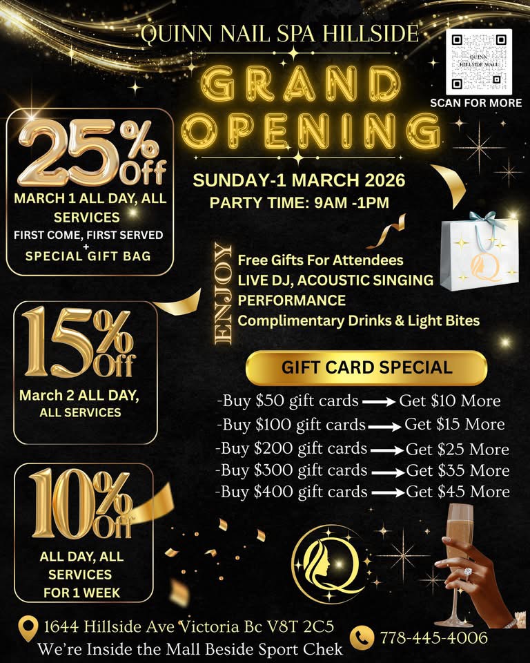 Discover beauty and care at QUINN NAIL SPA HILLSIDE MALL, offering everything from natural manicures and pedicures to facials, lash extensions, tinting, and kids’ services. Enjoy expert treatments in a calm, stylish space.